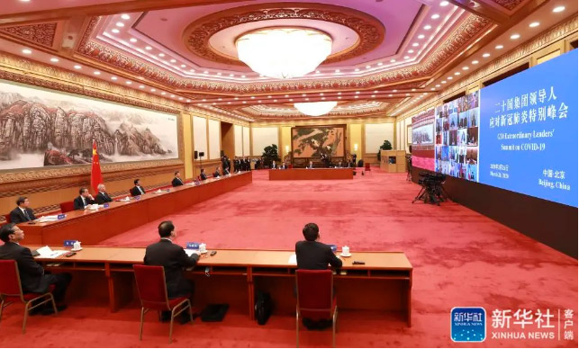 ↑3月26日,國家主席習近平在北京出席二十國集團領導人應對新冠肺炎特別峰會并發(fā)表題為《攜手抗疫 共克時艱》的重要講話。新華社記者 李學仁 攝